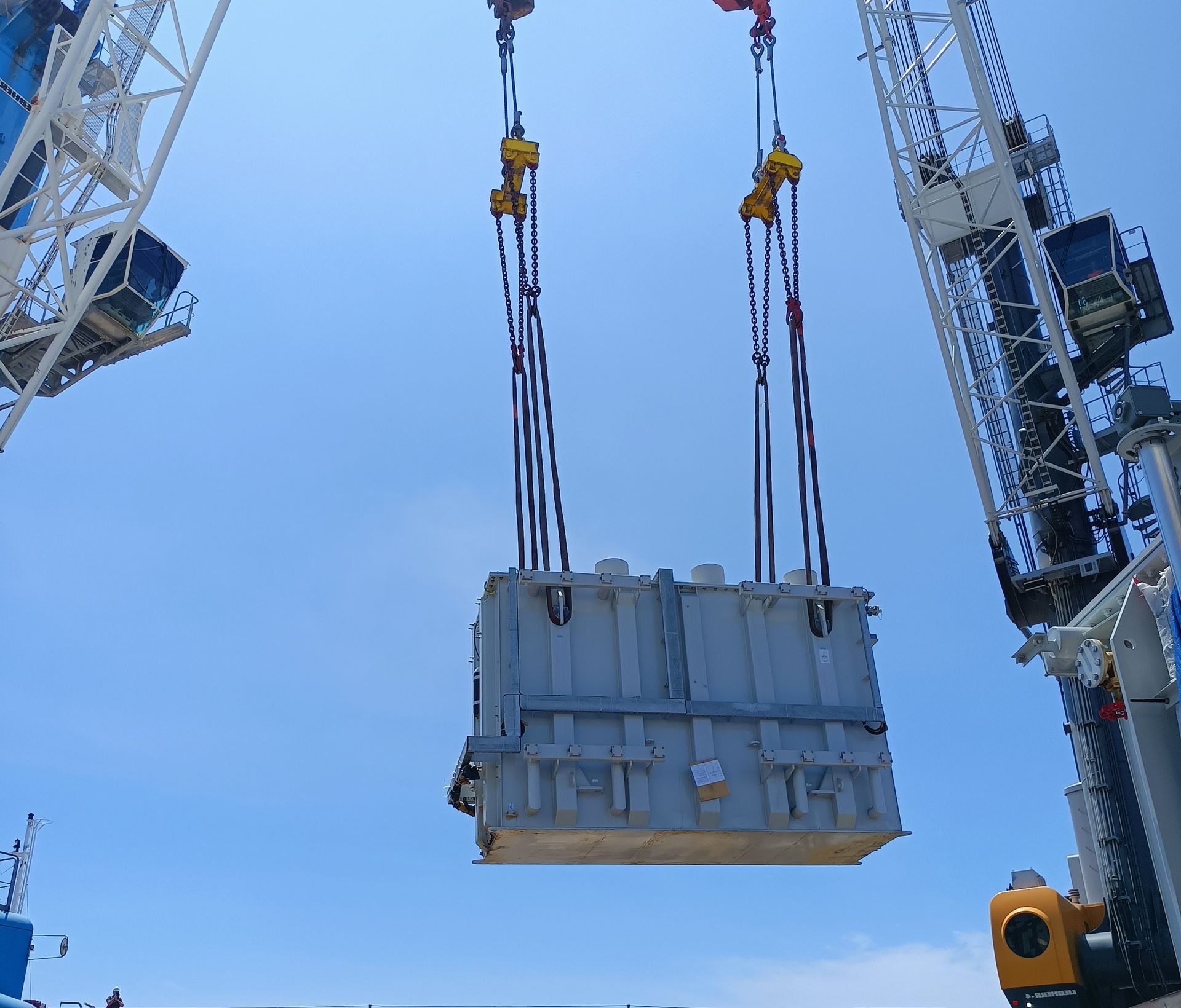 The Transformers were discharged by means of two shore cranes fitted with spreader and nylon bands.